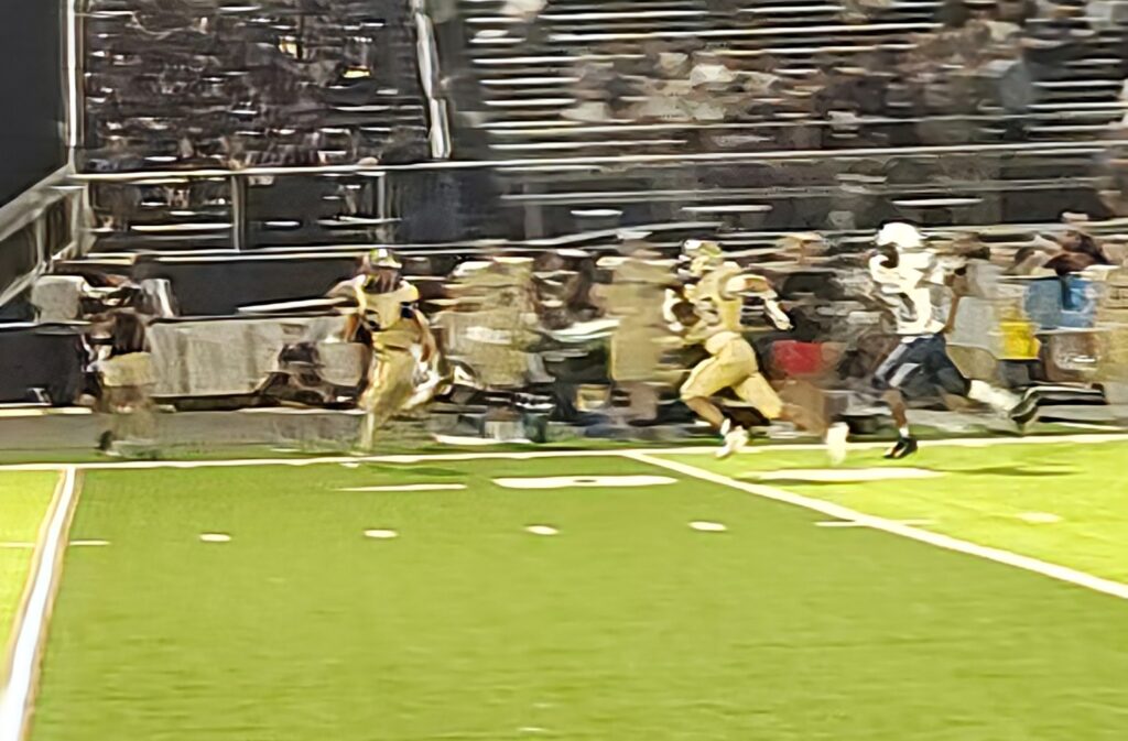 Sledge caught a short punt on a dead run and quickly hit the right sideline. He picked up a couple key blocks and bolted into the open field, scoring on a 69-yard punt return with 2:36 showing on the scoreboard clock. The PAT attempt failed.