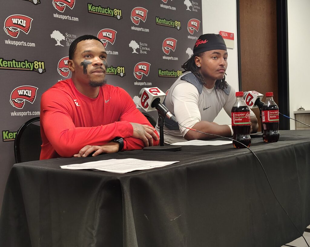 Western Kentucky defenders Anthony Brackenridge and Avarion Cole were bought up to the press box as Tyson Helton, the Hilltoppers’ eighth-year head coach, was finishing his presser with the assembled media on Saturday night at WKU’s Houchens-Smith Stadium.