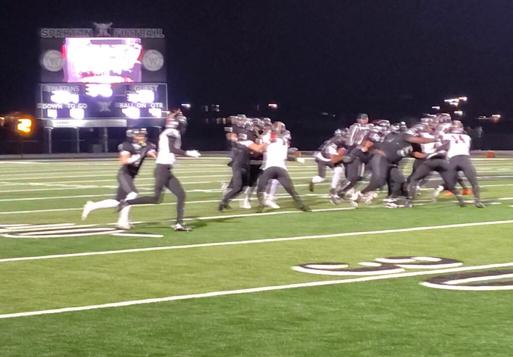 That’s when South QB Camden Page faked an inside handoff and rolled to his right, finding Spartans receiver Justin Capps at the goal line for a pretty 31-yard touchdown pass. Page then used a quarterback draw to add the two-point conversion, putting the Spartans in front, 21-14.
