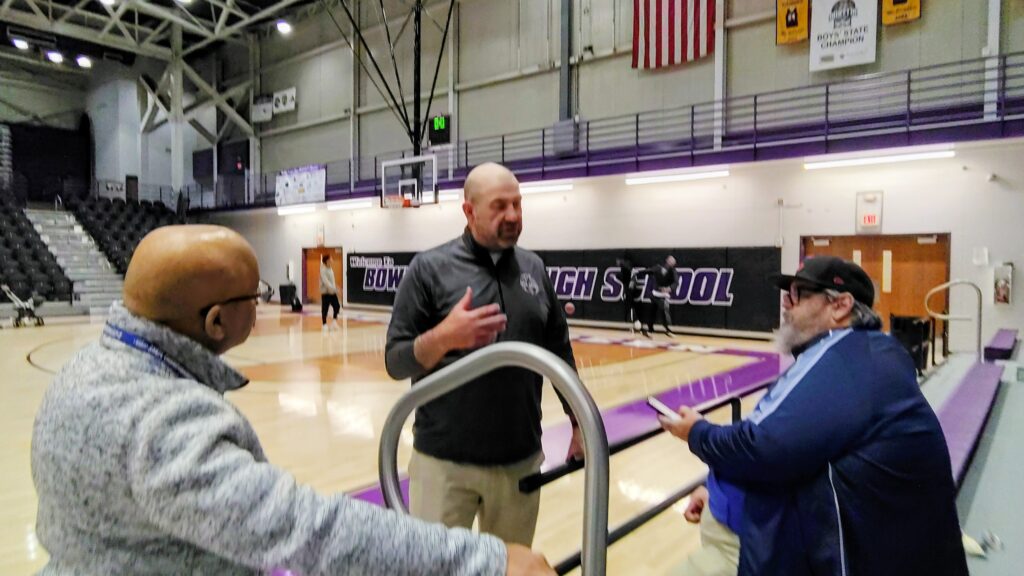 D.G. Sherrill, the Purples’ hard-charging, colorful coach, met with his team for a few minutes in the locker room before doing an extensive interview with Joe Brunk of the Sporting Times Network. By the time Sherrill descended to the floor, to do some Q-and-A with print reporters, he seemed ready to get his team back on the court for Game No. 2 …