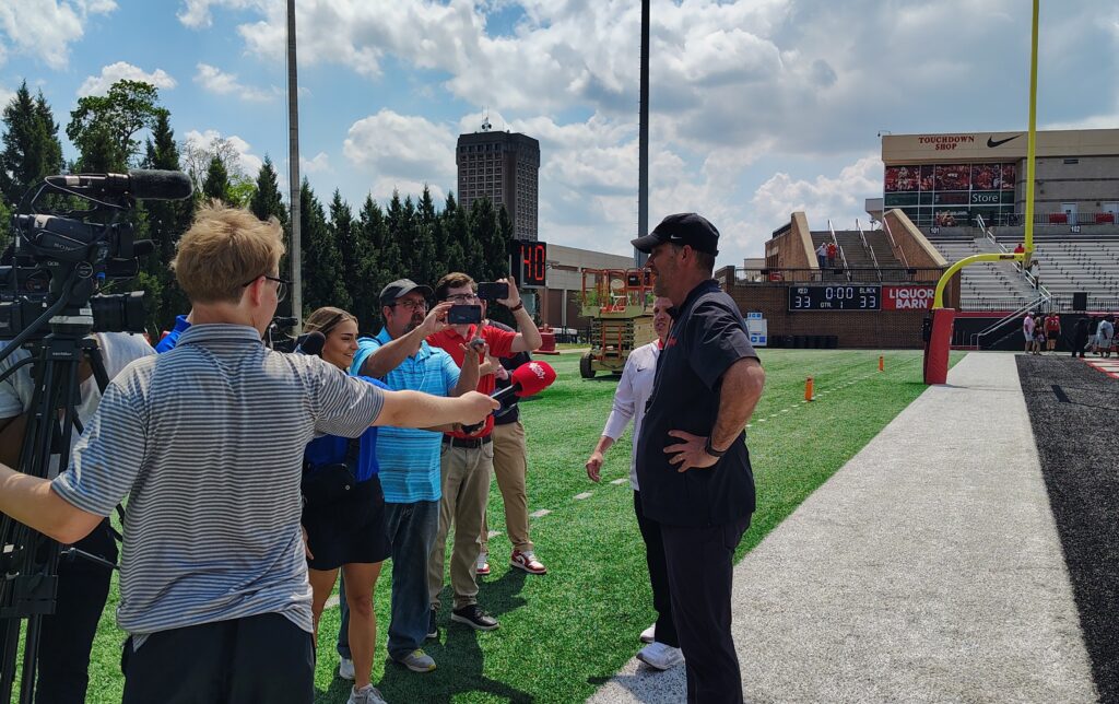 There were plenty of new faces in red, black and white, and after Helton met with the media, two players from WKU’s offense and defenses fielded questions inside the Avenue of Champions end zone.